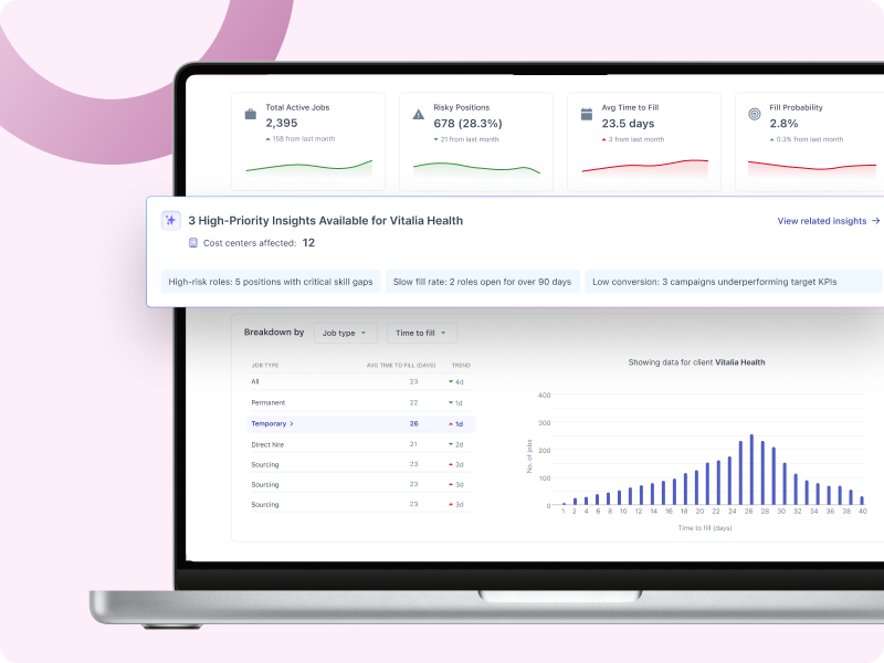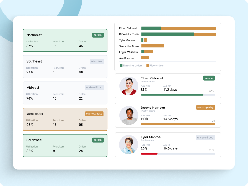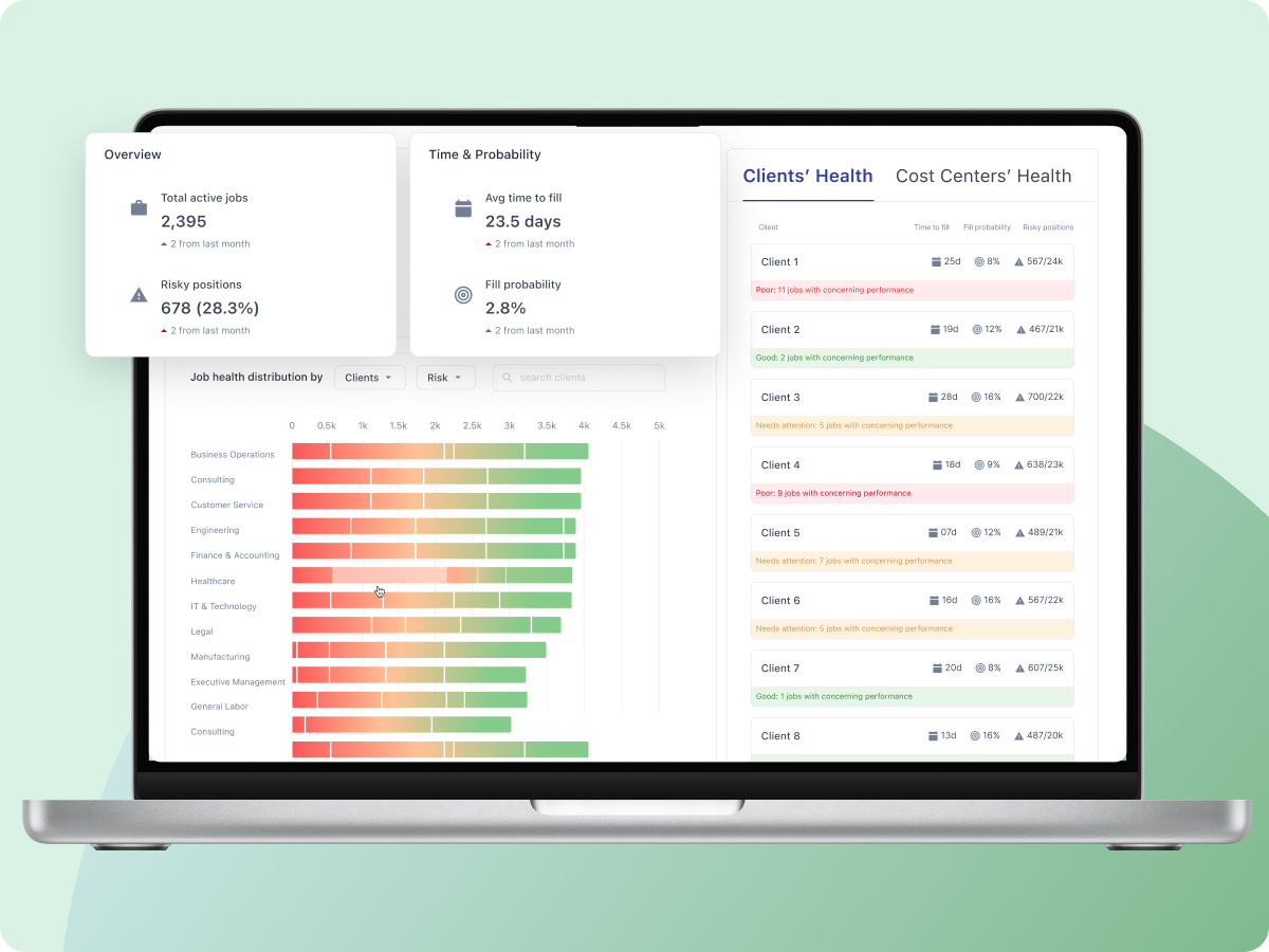 Put an end to the chaos with a predictive analytics and recommendations platform built for staffing. It does more than visualize data – it advises you on what needs to be done, and where to invest your time, resources, and energy. The platform predicts fill risk early, flags revenue threats before clients notice, and shows your team where to focus to stay ahead.