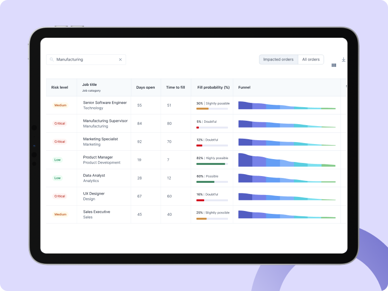 Your most profitable job orders shouldn’t hide in a spreadsheet. Bring them front and center, highlight the roles with the highest likelihood of filling fast and generate revenue, STAT. Recruiters spend less time guessing and more time closing. Quick wins stop being lucky breaks and become the norm.