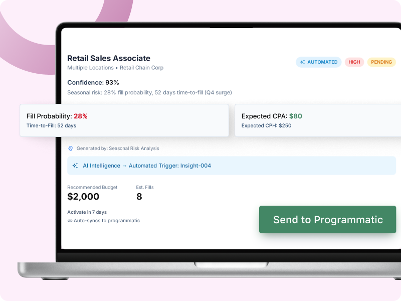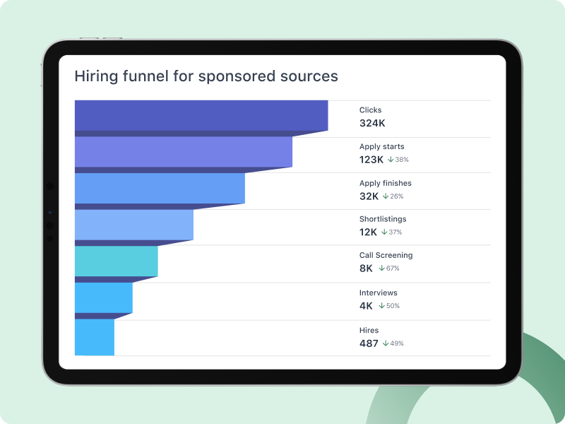 For roles that need an extra push, level up with built-in programmatic job ad intelligence. Get recommendations on where to spend targeted budgets to boost visibility — all tracked through one unified, full-funnel dashboard. Every click, apply, and placement tied back to ROI and source… guesswork required.