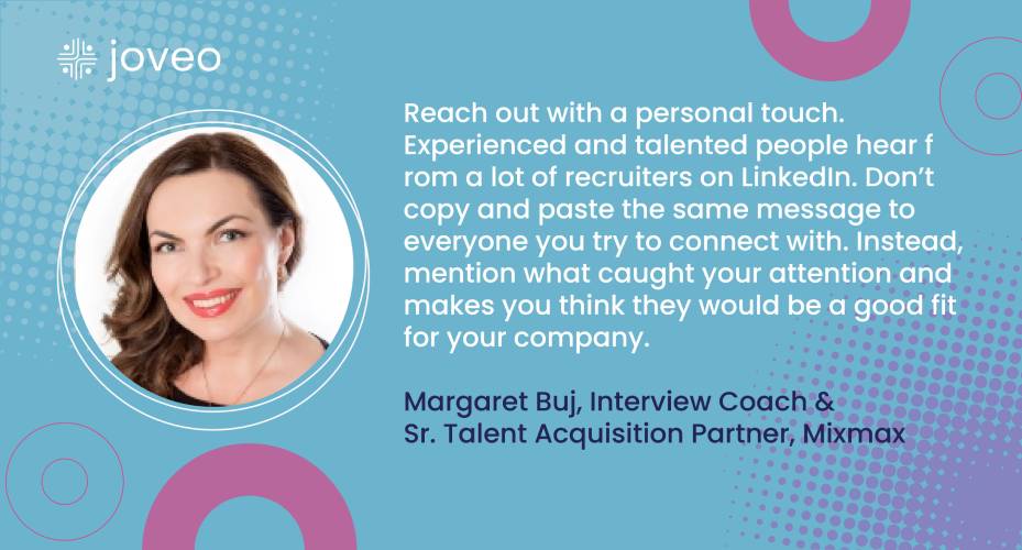 2) Reach out with a personal touch. Experienced and talented people hear from a lot of recruiters on LinkedIn. Don’t copy and paste the same message to everyone you try to connect with. Instead, mention what caught your attention and makes you think they would be a good fit for your company.”