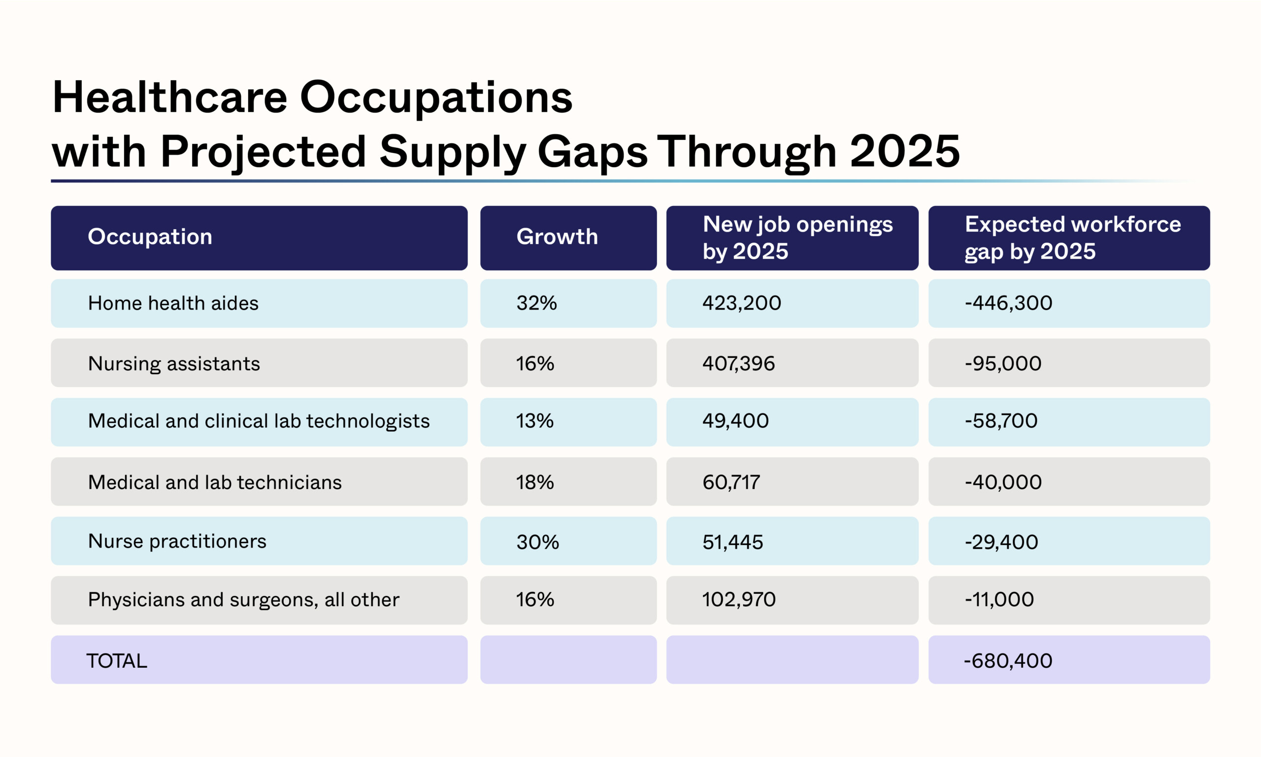 While no one could have predicted the impact of the pandemic, healthcare industry stakeholders had raised concerns about labor shortages prior to 2020. In 2019, the Association of American Medical Colleges (AAMC) predicted a shortfall of up to 124,000 physicians by 2034. Perhaps more dramatic, however, is a 2018 Mercer report predicting a shortage of nearly half a million home health aides, 95,000 nursing assistants, and more than 29,000 nurse practitioners – a shortfall of more than 680,000 medical professionals – by 2025.