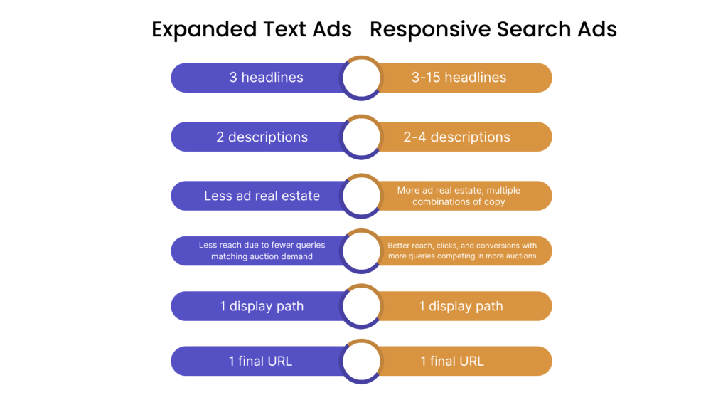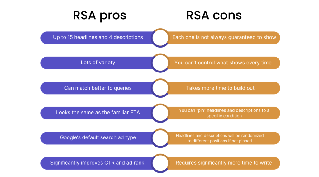 One more thing: While RSAs allow more headline and description options, the character count for these fields remains the same as ETAs: up to 30 characters for headlines and up to 90 characters for descriptions.