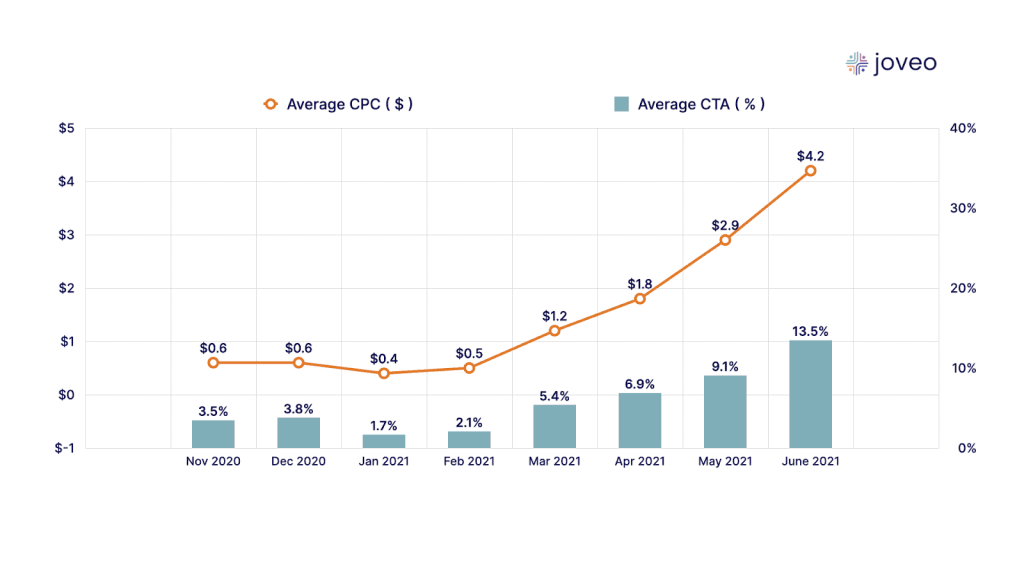 The average cost per click (CPC) soared from $0.6 in November 2020 to $4.2 in June 2021 – a seven-fold increase in just six months! This is indicative of how desperate e-commerce employers are to source more warehouse workers today.