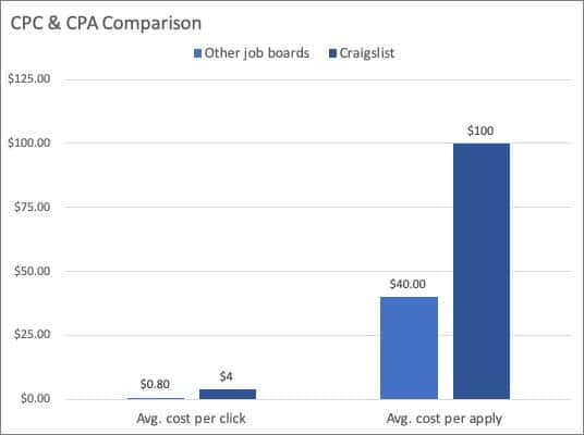 Unlike job board visitors who are actively trying to find a job, Craigslist visitors might stumble on one. Job boards also often have an “easy-apply” feature in the interest of converting as many clicks into applications as possible. They also will promote similar jobs to the applicant with the intent of increasing application conversions. As a result, job boards tend to have a much higher volume of applications than Craigslist. Because these features drive volume, i.e., more clicks and more applications, they result in job boards having lower cost-per-click (CPC) and lower cost-per-apply (CPA) rates.