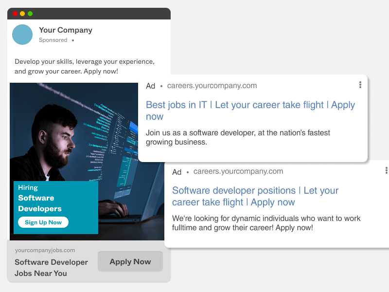 First, we help you maximize apps from free sources – specifically, that career site and ATS of yours. Next, we fine-tune your campaigns across paid channels, from job sites to social media, and search.