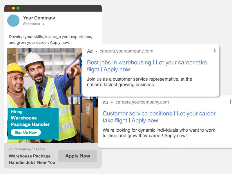 First, we help you optimize applications from free sources – career site, ATS, etc. Then, we fine-tune your campaigns across paid channels, from job sites to social media, and search.