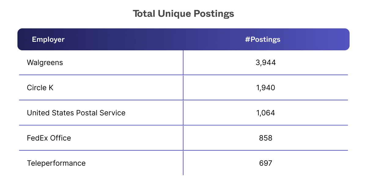 The competition is heated when it comes to recruiting CSRs! Top employer Walgreens distributed close to 3,000 unique job postings. Other familiar faces rounding out the top companies posting the most include FedEx and Circle K.