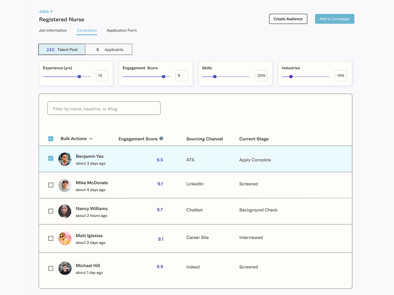 Stop settling for the status quo. The key to rocking those talent sourcing goals lies in engaging your talent community more effectively. How? Well, through a combination of personalized emails and text messages, of course. It’s time to make your candidate database work for you and create experiences that convert.